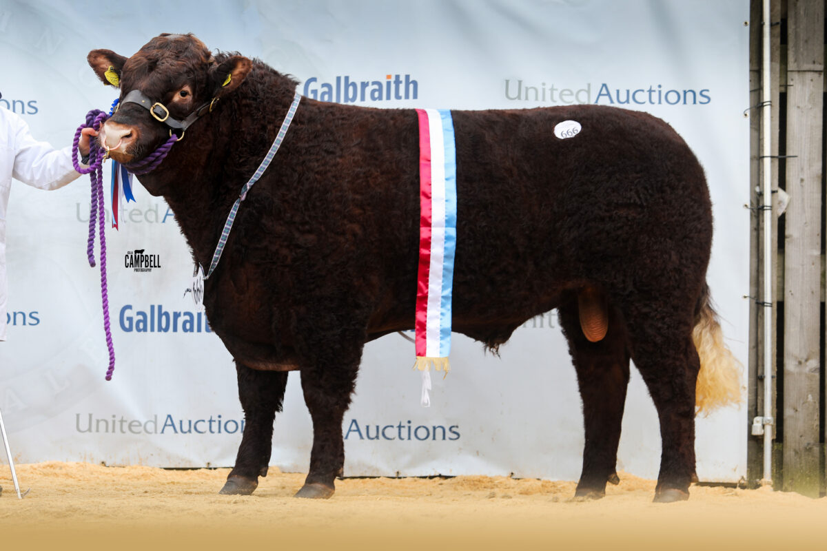 Taking top honours and lifting the overall championship was Lot 669, Cleuchhead Ultra. The horned bull, born on 13 April 2024 by Cleuchhead Rockefeller and out of Havane (Nana) (IMP), has successfully served 15 heifers at home. He was knocked down at 15,000gns to the Rusko herd of N & D Austin Ltd, Gatehouse of Fleet, Kirkcudbrightshire.